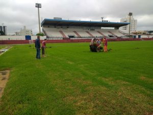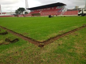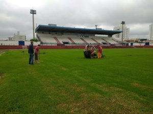 Começou na manhã desta quinta-feira, 22, a substituição dos 7.140 m2 do gramado do estádio municipal Vidal Ramos Junior, Tio Vida. A metragem também sofrerá alteração. Vai passar para 105 metros de extensão por 65 metros de largura. As traves serão recuadas em dois metros. O novo grama será bermuda.