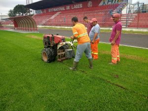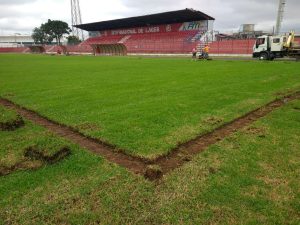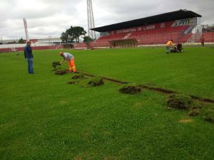 Conforme prevê o edital, a grama que está sendo retirada, será plantada no campo suplementar, anexo ao Tio Vida. A próxima etapa a após a retirada, será o nivelamento da área.
